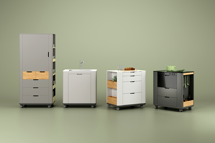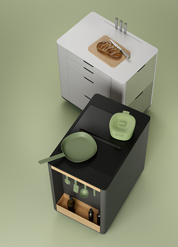 Each kitchen module consists of a base plate and a chassis, on which the correct parts are mounted. This makes it easy to customize the modules according to your preferences, and the sides of the module can also be utilized for extra storage space. Think of cutting boards, a spice rack, or cooking utensils. And if you move, you can take everything with you, wherever you go.