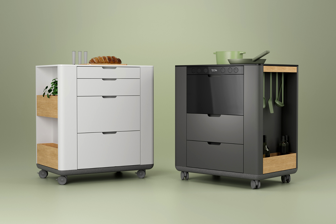 Each kitchen module consists of a base plate and a chassis, on which the correct parts are mounted. This makes it easy to customize the modules according to your preferences, and the sides of the module can also be utilized for extra storage space. Think of cutting boards, a spice rack, or cooking utensils. And if you move, you can take everything with you, wherever you go.